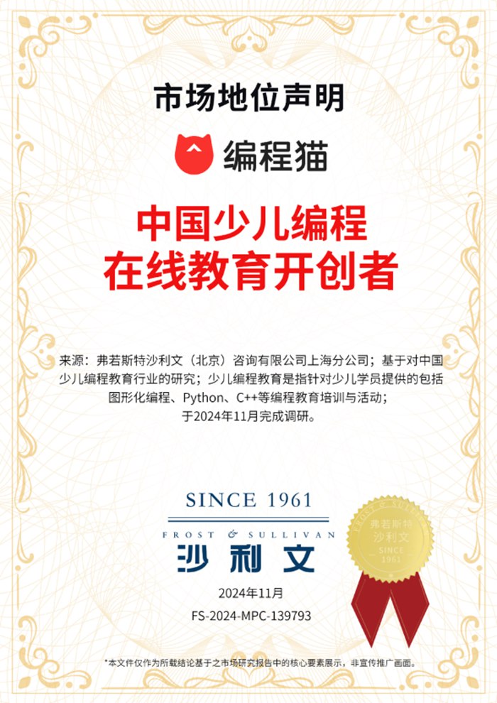 近日,全球頂尖研究及咨詢機構弗若斯特沙利文(Frost & Sullivan)授予編程貓“中國少兒編程在線教育開創者”“中國少兒編程教育品牌累計用戶數第一”“中國少兒編程教育編程軟件累計使用人數第一”三項市場地位聲明書。