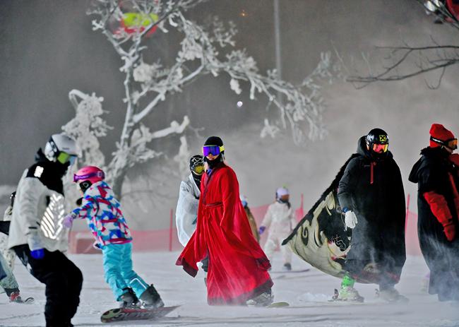 觀眾的視線從舞臺轉向雪道,這場“以冰雪為媒,以文化為魂”的表演開啟新的篇章——M.v滑雪俱樂部成員化身《雪山飛狐》中的俠客,動作行云流水,不斷換刃炫技,與雪道上的雪友互動,將冰雪秀的氛圍推向高潮。