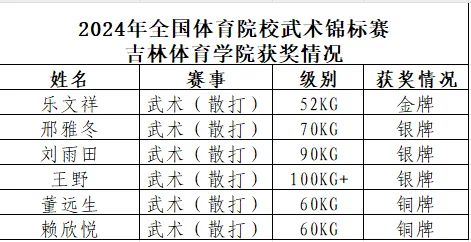 本次比賽,吉林體育學院武術與民族傳統體育學院派出21名學生參加了武術套路和武術散打兩個項目,經過激烈角逐,他們在武術套路和武術散打兩項比賽中共取得2金6銀3銅的佳績。該校2022級學生賴欣悅榮獲“最佳拼搏獎”,教師姜志鵬榮獲“優秀裁判員”稱號。