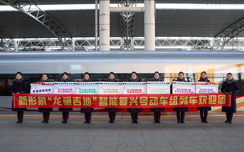 這趟G912次列車由沈陽局集團有限公司長春客運段動車二隊擔當乘務工作。為慶祝吉林省首趟“智能復興號”開行,車隊還組織職工文藝骨干編排了精彩的文藝節目,與旅客互動。