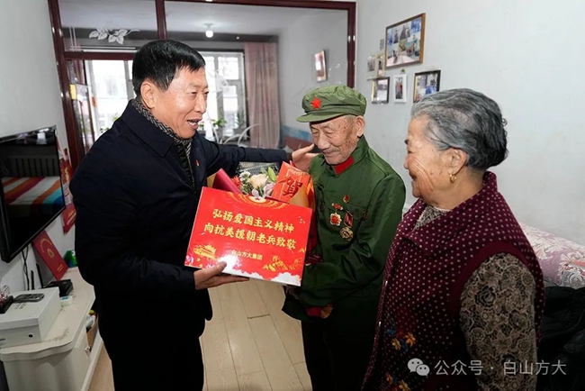 為大力弘揚擁軍優屬光榮傳統,表達社會各界對參戰老兵們的崇高敬意,彰顯企業社會擔當,2025年元旦期間,白山方大集團黨委書記、董事長寧鳳蓮帶領班子成員、黨員、青年志愿者看望慰問參戰老兵,為他們送去社會大家庭的關懷和溫暖,向他們致以崇高的敬意和節日祝福。
