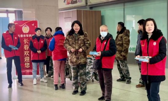 活動現場,30余名身著迷彩工作服和“紅馬甲”的軍供志愿者分為四組,在長春市火車站南北出站口、換乘大廳、自助取票口設立“愛心驛站”志愿服務臺,為來往游客和市民開展引導咨詢、秩序維護、熱飲供應、政策宣傳等志愿服務,發放春節掛飾、福字等小禮品,現場氛圍溫馨和諧。志愿者們在鐵路長春站內場地為游客指引附近公交和地鐵站點,介紹長春市文旅局制作的“長春冬季旅游圖”,大力宣傳長春市冰雪旅游。聚焦過往退役軍人,結合城開運營公司提供的宣傳電子屏,講解了退役軍人、其他優撫對象優待證在吉林省內的有關優惠政策?;顒舆€特別設立“送溫暖”環節,針對老弱病殘孕等特殊旅客群體,主動幫助搬運行李,護送行動不便的市民到達指定地點,并邀請火車站工作人員和環衛工人到服務臺休息,及時遞上冒著熱氣的紅糖姜茶,熱情提供暖心便民服務,進一步提升市民群眾的滿意度、獲得感。