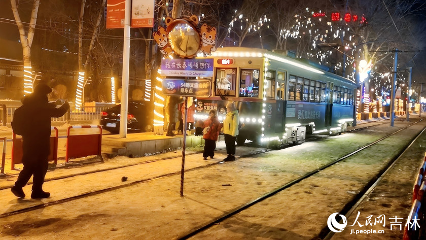 2月5日,吉林長春華燈初上,54 路文旅列車的車身霓虹與街邊的火樹銀花相映成趣,節日氛圍拉滿,游客紛紛拍照留念。人民網記者 王帝元攝
