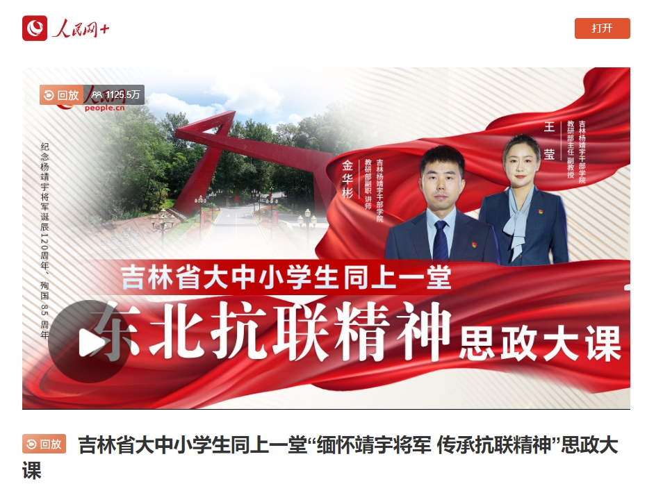 這場思政大課以直播的形式在“人民網+”客戶端開講,人民網吉林頻道PC端、人民網吉林視頻號、人民網吉林抖音號同步進行,吉林省大中小學生積極參與,反響熱烈,直播課程在線人數達到1200余萬人次?!锻弦惶谩熬拺丫赣顚④?傳承抗聯精神”思政大課開講!》稿件被重點范圍網站在雙首頁要聞區推送。