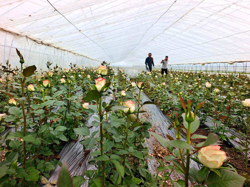 走進劉士成家的玫瑰花種植園區,花香撲面而來,玫瑰花亭亭玉立、搖曳生姿?!拔覀內昴懿扇绲剿牟?,每一茬一株能產四到五枝花。每年我們的第一茬花都是趕在5月中旬上市,為母親節、‘5·20’做準備?!背萄┘彝マr場負責人劉士成看著棚里的玫瑰介紹道。
