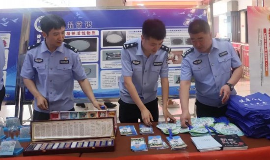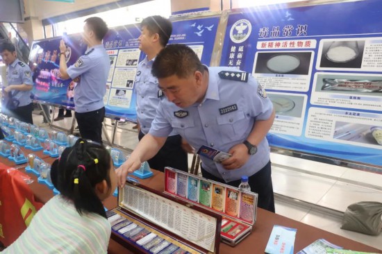 “原來這就是冰毒”“毒品原來有這么多種”“這么些種類毒品太可怕了”……伴隨著現場輕揚音樂,展臺前吸引了越來越多的市民朋友們駐足觀看。一位帶著孩子的年輕媽媽牽著女兒的手湊近展臺,眼神中滿是警惕:“警察同志,現在這些毒品偽裝得五花八門,我們做家長的該怎么教孩子識別???”民警立刻從展板上取下一張 “新型毒品偽裝圖鑒”,耐心解釋道:“您看,這種彩色小顆?!恰?、包裝精美的‘止咳水’,都可能是毒品。平時要多和孩子強調,來歷不明的東西一口都不能碰?!闭f著,還遞上一本圖文并茂的兒童版禁毒手冊,小女孩睜著大眼睛,認真翻看著手冊上的卡通禁毒故事。人群中,幾位白發蒼蒼的老人也擠到前排,其中一位拄著拐杖的大爺感慨:“現在的毒品比我們那時候狡猾多了!”民警趕忙扶住大爺,笑著回應:“大爺,您可得把今天學到的知識帶回去,給街坊鄰居都講講。有些不法分子專門騙老年人,把毒品偽裝成保健品,咱們得多留個心眼!”大爺聽后連連點頭,小心翼翼地把禁毒宣傳冊塞進上衣口袋。
