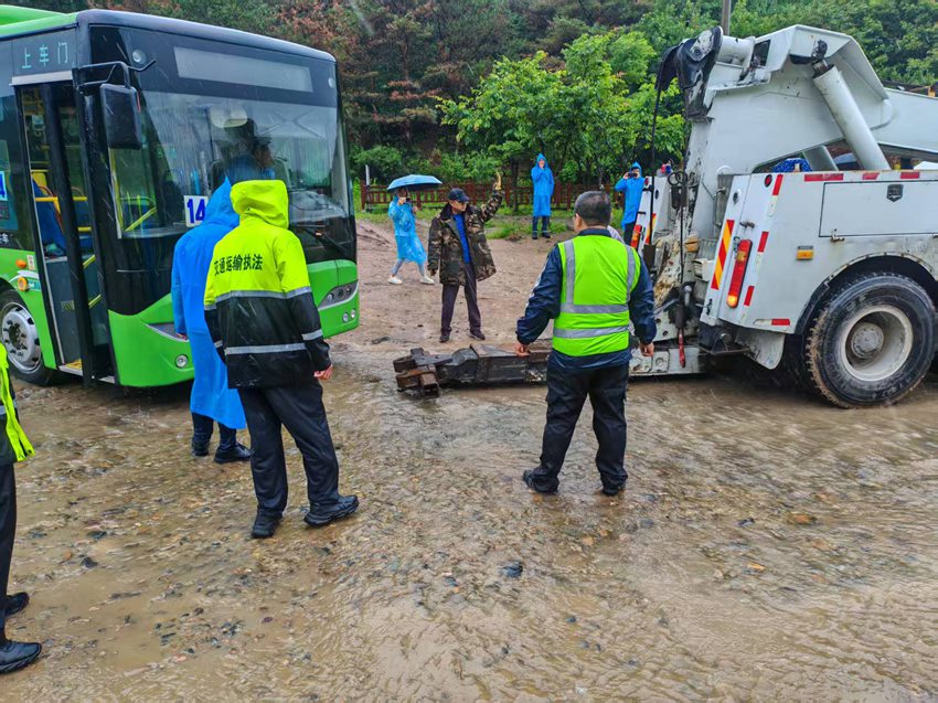 演練場景設定為暴雨天氣下,一輛正在運營的公交車行至積水路段,車輛熄火,情況危急。駕駛員迅速按照應急預案,向調度中心報告,并開啟危險警示燈,安撫車內乘客情緒。接到報告后,相關部門馬上行動,工作人員攜帶救援設備迅速到達事發地點,對車輛進行緊急救援,在現場設置警示標志,引導乘客轉移到安全地點,并將被困車輛拖離積水區域。在整個演練過程中,各參演單位緊密配合、迅速響應,高效有序地完成了車輛救援、人員疏散、交通疏導等各項任務。