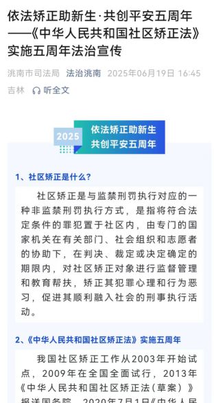 活動四:法條解讀廣覆蓋 亮點宣傳入人心。利用“法治洮南”微信公眾號持續推送“依法矯正助新生 共創平安五周年”主題宣傳內容。重點轉發權威條款解讀、普法短視頻等,深入淺出地介紹社區矯正監督管理、社會力量參與等特色亮點,有效擴大法律法規宣傳的覆蓋面和影響力。