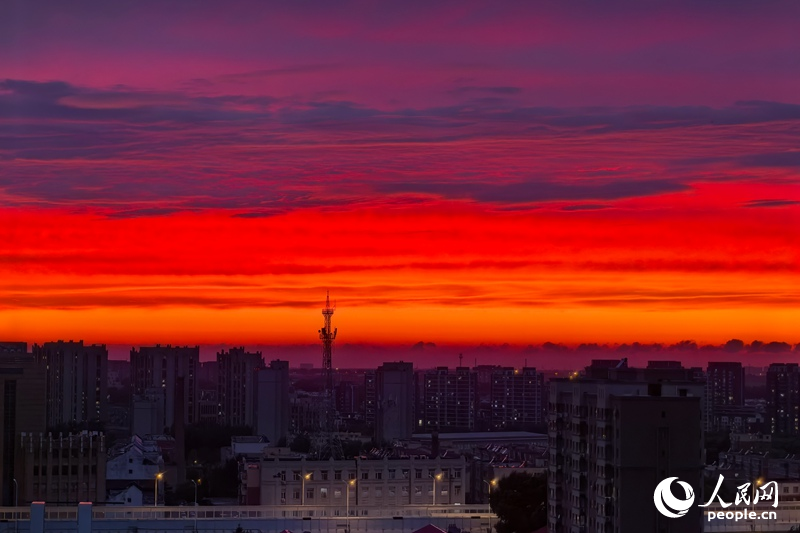7月20日傍晚,長春市上空現大面積“火燒云”和雙彩虹景觀?;馃茖⑻炜杖境梢黄燃t,晚霞滿天,蔚為壯觀。