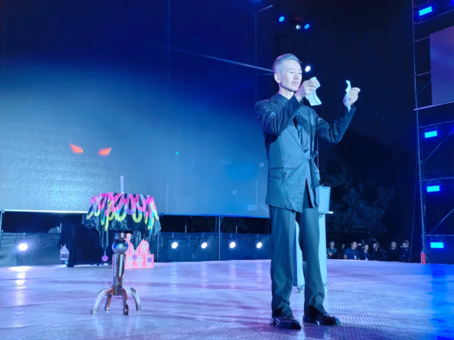 隨著主持人的激情開場,觀眾參與現場抽獎活動的熱情也隨之高漲,更是把熱烈的掌聲送給臺上的各位歌手。晚七點整,在馬頭琴悠揚的琴聲里,演出正式拉開了帷幕,一首蒙古歌曲《酒歌》唱出了寧江大地的豪邁與民族特色,接下來的《紅塵來去一場夢》《用心良苦》等經典曲目點燃了現場的氣氛。奇幻精妙的魔術表演讓在場的群眾都張大嘴巴直呼神奇,贏得了陣陣叫好聲。接下來的歌曲《當》《責無旁貸》《沒那么簡單》《攙扶》也是余音繞梁,讓人回味,沉浸在音樂的海洋。