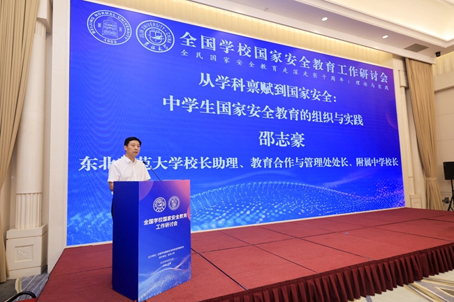 研討會引導性發言環節由吉林大學公共外交學院、國家發展與安全研究院院長、教指委委員肖晞主持。國防大學少將、教指委委員唐永勝,北京師范大學副校長、教指委副主任委員汪明,上海市教育衛生工作委員會副書記、教指委副主任委員顧紅亮,東北師范大學校長助理、附屬中學校長邵志豪圍繞“關于《新時代的中國國家安全》白皮書的理解和認識”“學校國家安全教育的現狀與發展”“開展學校國家安全教育工作的探索與體會”“中學生國家安全教育的組織與實踐”等主題進行了交流發言。