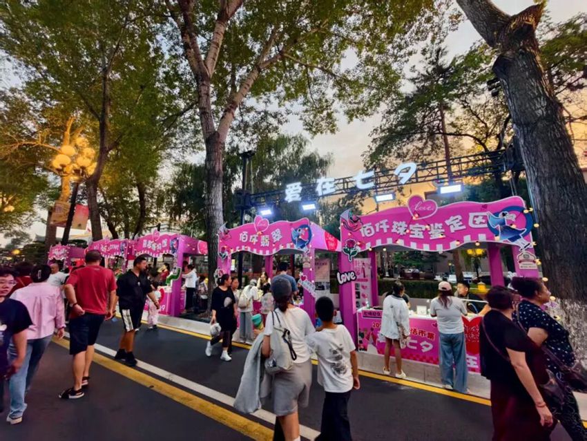 華燈初上,煥然一新的新民大街游人如織,燈光與歷史建筑交相輝映。市集攤位前圍滿熱情顧客;互動區洋溢著歡聲笑語與打卡留念的身影;七夕主題區內,情侶們專注挑選插花材料,親手制作愛的信物;演出現場,動感音樂與活力舞蹈點燃觀眾熱情,臺下掌聲雷動,匯成歡樂海洋;潮流文化展示區中,創意手工藝品、新奇潮玩吸引年輕人駐足品鑒、熱烈交流,盡顯街區的青春活力與時尚魅力。
