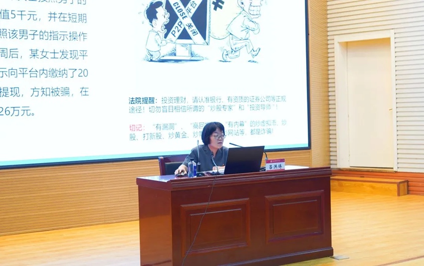 刑事審判庭員額法官呂洪博圍繞“防范電信網絡詐騙”這一主題,通過近年來的案件增速、涉案資金規模、相關部門攔截的詐騙電話數量等權威數據,向在場師生生動清晰地揭示了當前電信網絡詐騙高發的嚴峻態勢,提醒大家在日常生活中要保持警覺,不可松懈。