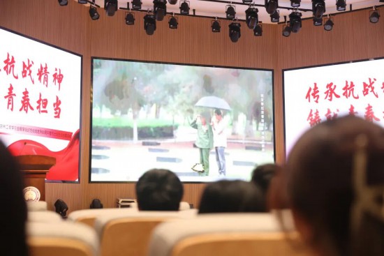 報告廳內座無虛席,肅穆與崇敬的氣息像暖潮般包裹著每一寸空間。大屏幕上,“傳承抗戰精神 鑄就青春擔當” 十二個鮮紅大字熠熠生輝,宛如一盞明燈,時刻提醒著在場師生:歷史從不是書本上冰冷的文字,而是由無數熱血生命書寫的滾燙篇章?;顒娱_始前半小時,報告廳的入口便排起了長隊。學生們或手捧筆記本,專注翻閱著抗戰史料,筆尖不時在關鍵處勾畫;或圍在一起輕聲交流,年輕的眼眸里滿是對老戰士的期待與對歷史的敬畏,那份純粹的向往,讓整個空間都變得格外莊重。