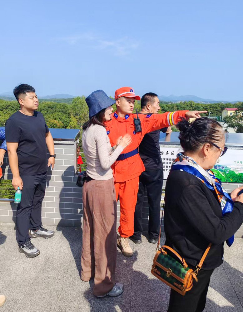 溫情故事在林間不斷上演。一位防火隊員正伸出手臂,為幾位游客指引遠方的風景,并詳細講解著景點的歷史和特色。他們目光所及,是吉林秋日的壯美山河和豐富文化。在觀景平臺,另一位防火隊員主動接過游客的手機,幫忙拍下與家人的珍貴合影,身后的警示牌“禁止倚靠”也成了無聲的安全提醒。還有一位防火隊員抱起一個小朋友,并把手中的望遠鏡遞給他,助力孩子“登高望遠”。更有幾位防火隊員為爆胎車輛,以最快速度更換了輪胎,得到了車主的連連稱贊。
