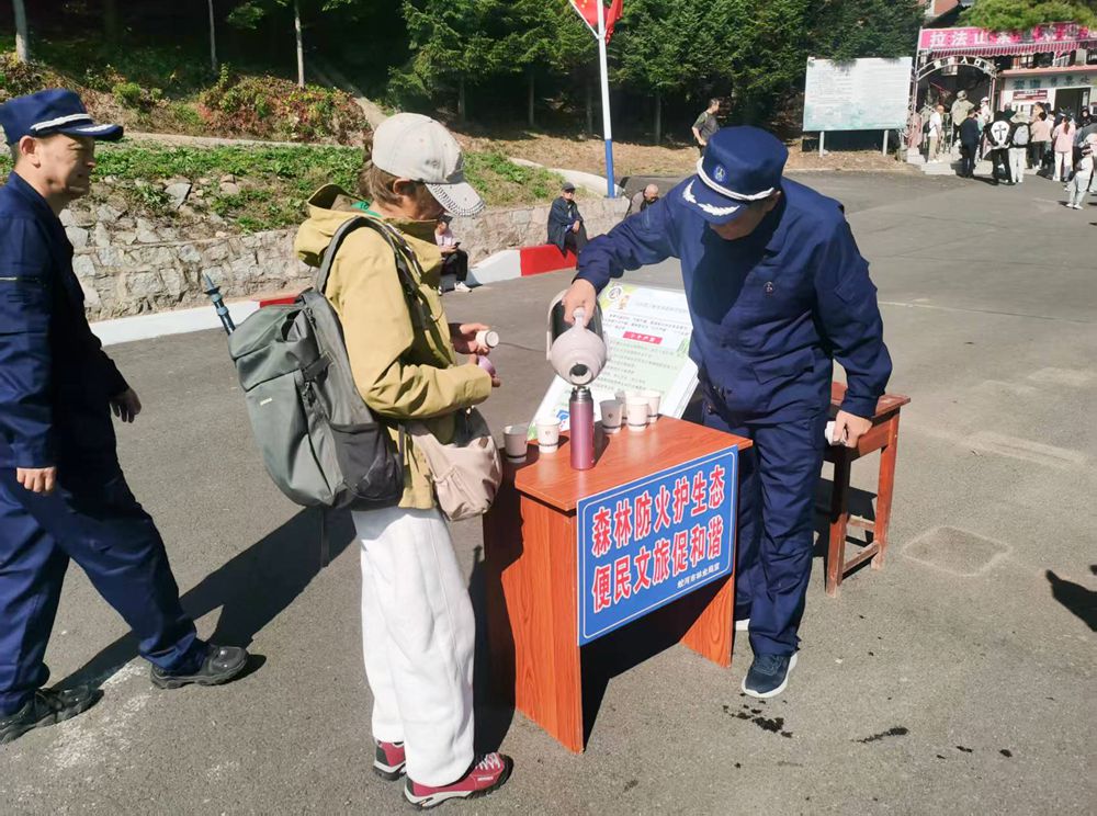 在G331沿線等旅游服務點,身著紅色或藍色制服的防火員微笑著將一杯杯熱水和宣傳冊遞到游客手中,并熱情地回答著有關森林防火、游玩攻略等各種問題。桌上擴音器、熱水壺、紙巾等一應俱全,“森林防火護生態 便民文旅促和諧”的標牌醒目而溫馨?!拔覀儾粌H是防火員,還是義務講解員、導游、攝影師,更是‘活地圖’?!币晃徽诂q春市森林火災預防中心執勤的防火員說道。他手持對講機,目光如炬,守護著車輛與山林的安全,也隨時準備為游客指路答疑。